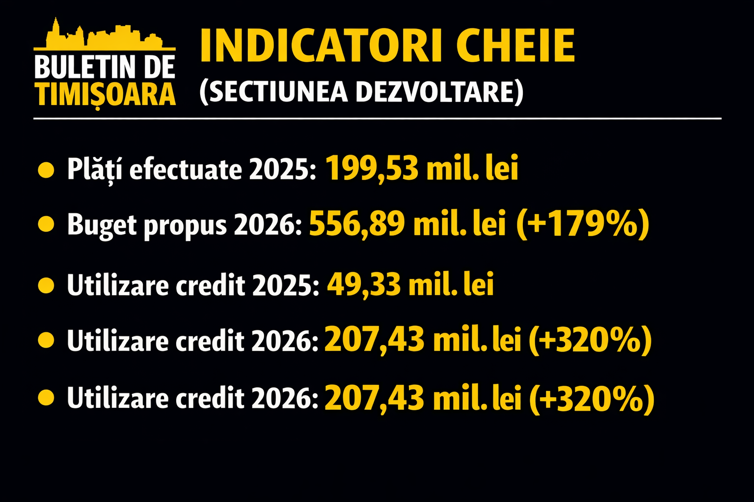 Pentru 2026, Consiliul Județean Timiș forțează nota, propunând cheltuieli de dezvoltare de 556.893.830 lei, o creștere de 179% față de plățile realizate anul trecut.