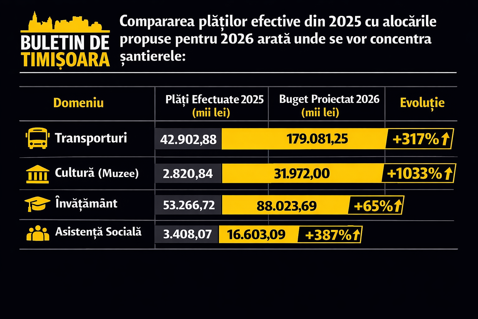 3. Dezechilibru ecologic și de mediu: În timp ce transporturile și sportul primesc sume record, domenii precum Protecția Mediului înregistrează o scădere a bugetului de dezvoltare, de la 17.844.907 lei (execuție 2025) la 12.917.600 lei în 2026.