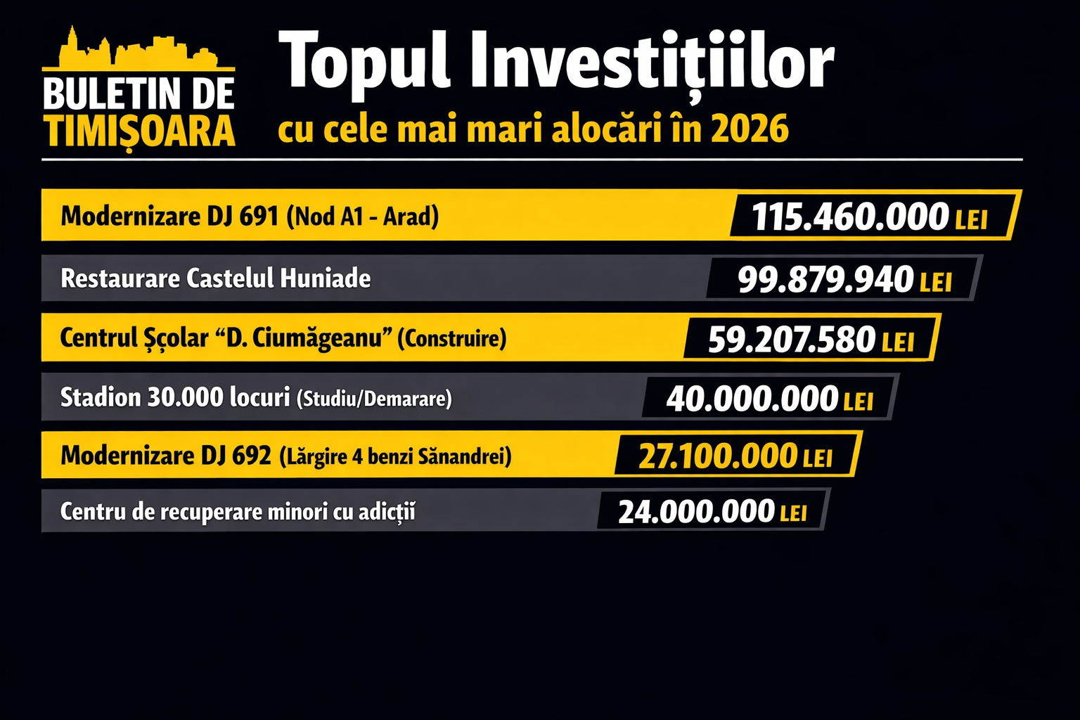 1. Infrastructură Rutieră (279,5 mil. lei): Prioritatea zero este modernizarea DJ 691 (Nod A1 – limită Arad), cu o alocare de 115.460.000 lei. Totodată, lărgirea la 4 benzi a DJ 692 (DN 6 – Sânandrei) primește 27.100.000 lei.