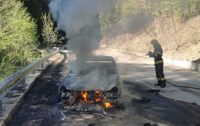 VEST: mașină distrusă de flăcări pe un drum județean din zona Slatina Timiș – muniție descoperită la Vrani