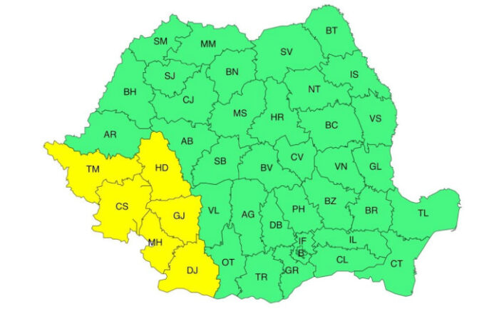 De asemenea, acelaşi cod este valabil de luni, de la ora 23.00, până marţi, la ora 12.00, pentru judeţele Caraş-Severin, Timiş şi Mehedinţi.