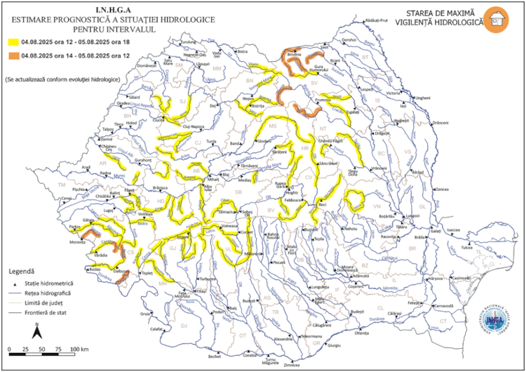 Hidrologii au actualizat avertizarea privind riscul de inundaţii, fiind emis Cod portocaliu pentru râuri din judeţele Suceava, Harghita, Neamţ, Caraş-Severin, Timiş şi Mehedinţi. De asemenea, sectoare de râuri din 24 de judeţe se află sub avertizare Cod galben.