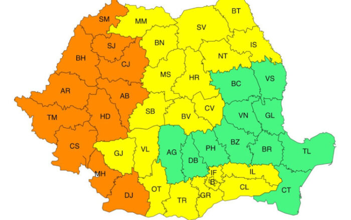 Totodată, în acelaşi interval orar este în vigoare un Cod portocaliu de temperaturi deosebit de ridicate, disconfort termic accentuat, caniculă, în judeţele Satu Mare, Sălaj, Cluj, Alba, Hunedoara, Caraş-Severin, Mehedinţi, Timiş, Arad şi Bihor.