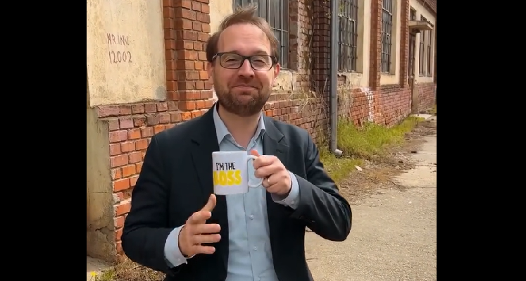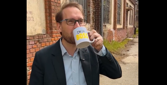 În video în care prezintă proiectul, primarul Dominic Fritz poate fi văzut cum beam cafea dintr-o cană inscripționată cu: I am the boss.