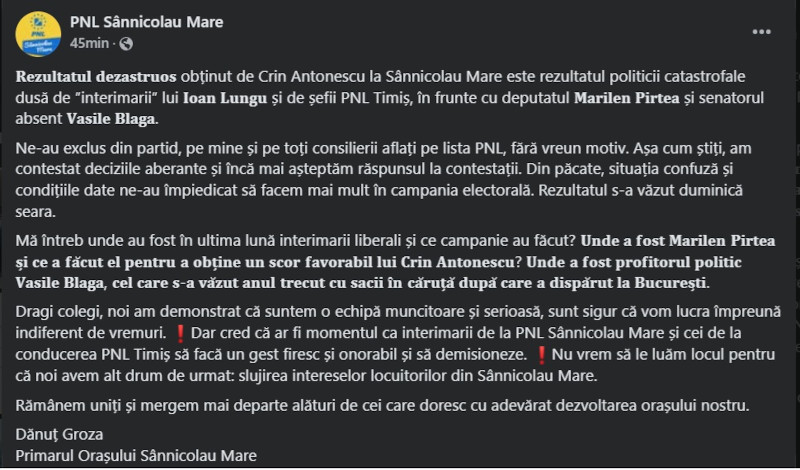 Rezultat dezastruos obținut de Crin Antonescu la Sânnicolau Mare este rezultatul politicii catastrofale dusă de ”interimarii” lui Ioana Lungu și de șefii PNL Timiș, în frunte cu deputatul Marilen Pirtea și senatorul absent Vasile Blaga. Ne-au exclus din partid, pe mine și pe toți consilierii aflați pe lista PNL, fără vreun motiv. Așa cum știți, am contestat deciziile aberante și încă mai așteptăm răspunsul la contestații. Din păcate, situația confuză și condițiile date ne-au împiedicat să facem mai mult în campania electorală. Rezultatul s-a văzut duminică seara. Mă întreb unde au fost în ultima lună interimarii liberali și ce campanie au făcut? Unde a fost Marilen Pirtea și a făcut el pentru a obține un scor favorabil lui Crin Antonescu? Unde a fost profitorul politic Vasile Blaga, cel care s-a văzut anul trecut cu sacii în căruță după care a dispărut la București. Dragi colegi, noi am demonstrat că suntem o echipă muncitoare și serioasă, sunt sigur că vom lucra împreună indiferent de vremuri. Dar cred că ar fi momentul ca interimarii de la PNL Sânnicolau Mare și cei de la conducerea PNL Timiș să facă un gest firesc și onorabil și să demisioneze. Nu vrem să le luăm locul pentru că noi avem alt drum de urmat: slujirea intereselor locuitorilor din Sânnicolau Mare. Rămânem uniți și mergem mai departe alături de cei care doresc cu adevărat dezvoltarea orașului nostru“, a explicat Dănuț Groza, primarul orașului Sânnicolau Mare.