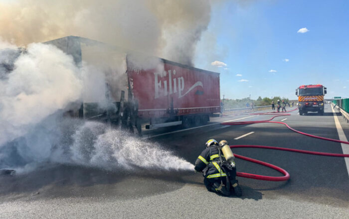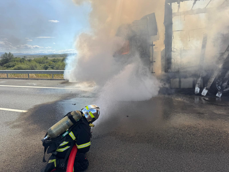 Un autotren încărcat cu componente metalice a luat foc, astăzi, pe autostrada A1, la kilometrul 455, pe sensul de mers Timișoara – Deva, după nodul rutier cu A6.