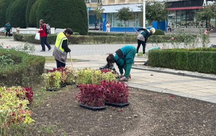 - Piața Victoriei: plivit covor floral, plivit și săpat trandafiri, plivit și tuns gard viu, transplantat arbuști și plantat plante perene.