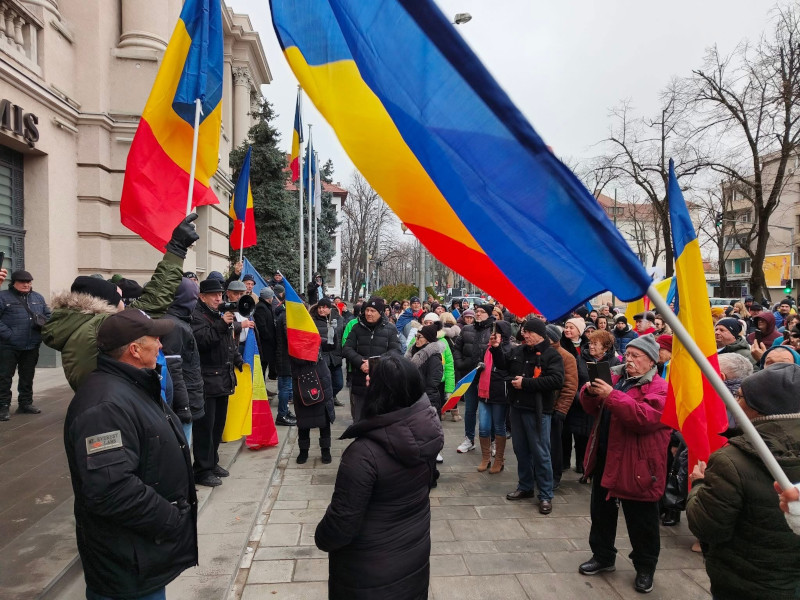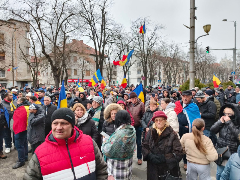 Câteva sute de persoane, membri și simpatizanți ai Alianței pentru Unirea Românilor (AUR), au protestat la Timișoara, în fața Prefecturii Timiș, nemulțumiți de decizia de anulare a alegerilor prezidențiale.
