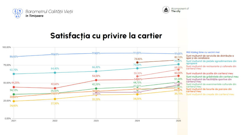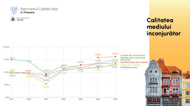 Trei sferturi din timișoreni consideră că orașul se îndreaptă într-o direcție bună, arată datele Barometrului Calității Vieții 2025, realizat de municipalitate în parteneriat cu Universitatea de Vest din Timișoara (UVT). Studiul indică îmbunătățiri ale percepției publice în mai multe domenii și, în premieră, măsoară nivelul de încredere în instituțiile locale, unde primele poziții sunt ocupate de companiile private, armată și primărie. Traficul, infrastructura rutieră și curățenia rămân domeniile mai frecvent reclamate, însă și la aceste capitole a existat o ușoară evoluție pozitivă a percepțiilor.