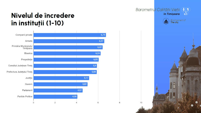 În premieră, barometrul a măsurat încrederea în instituțiile din Timișoara, pe o scară de la 1 la 10. Cele mai ridicate niveluri de încredere se înregistrează în cazul companiilor private, armatei, primăriei, bisericii și președinției (scoruri între 6 și 7), în timp ce partidele politice și parlamentul se află la finalul clasamentului (scoruri între 4 și 5).