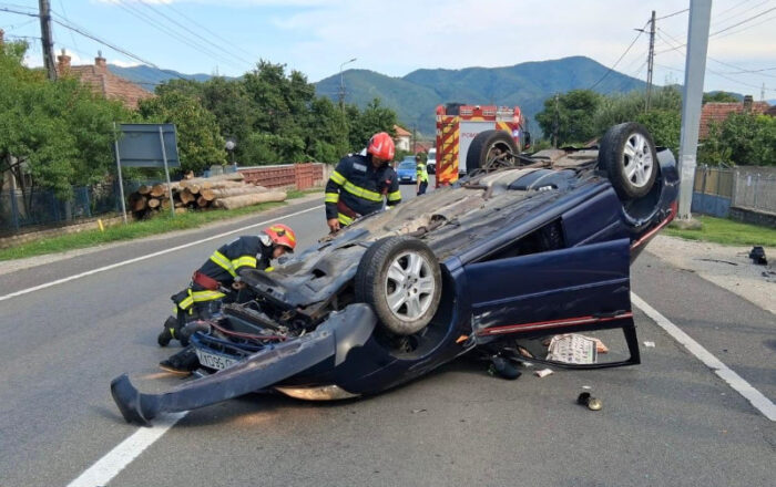 VEST: accident rutier pe DN 66 – un autoturism răsturnat în șanț și a lovit o altă mașină care era parcată în afara părții carosabile