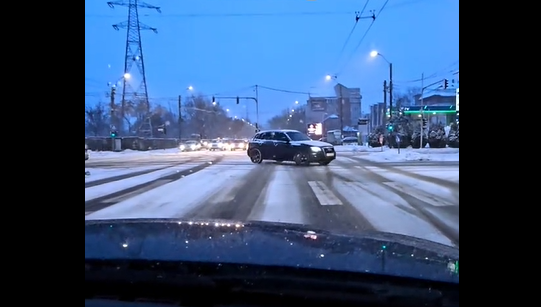 Imaginile arată cum mașina intră în derapaj controlat și traversează intersecția în alunecare, pe carosabilul acoperit de zăpadă.