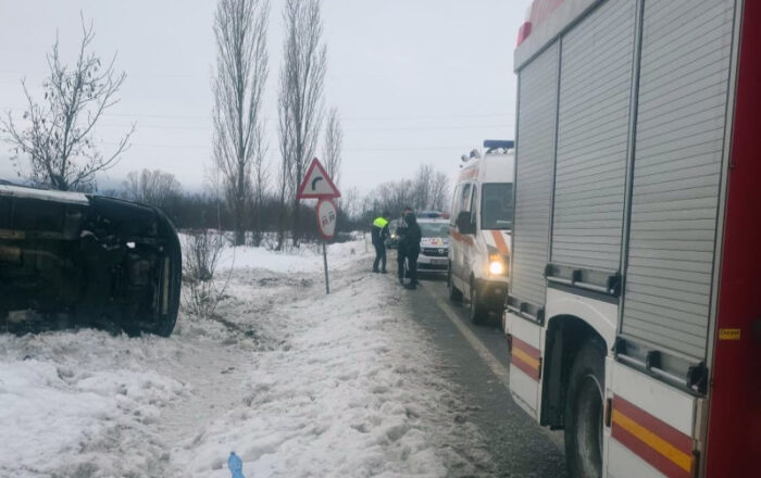 Pompierii ISU Hunedoara au intervenit miercuri dimineață în localitatea Călan, unde un microbuz a părăsit partea carosabilă și s-a răsturnat.